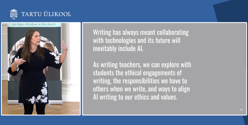 Later the same day, I joined a panel of University of Tartu faculty from English, computer science, and law. Djuddah moderated. We talked about the importance of education about AI for future employment, whether AI will aid creativity, how AI might undermine learning, and the role of the university in preparing students to use AI critically. Aleksei Kelli introduced legal controversies about contemporary authorship and technologies. Raili Marling advised caution. She made a distinction between learning and using, noting we should be wise to surface-level performance of knowledge. Heiko Pääbo argued that AI is the future. He reminded us to keep focused on curriculum and why students might want to use AI. Marling asked, “Is it time to stop giving assignments that AI can do?” “Yes,” Pääbo answered. Yurii Kondratyk, a recent graduate, said that we must use AI but also be aware of the hype: there are always students who will cheat, but we should be thinking about what critical engagement actually means. I was grateful to be among so many diverse and considered viewpoints on AI and learning. You can watch the panel here: https://uttv.ee/naita?id=35985 .